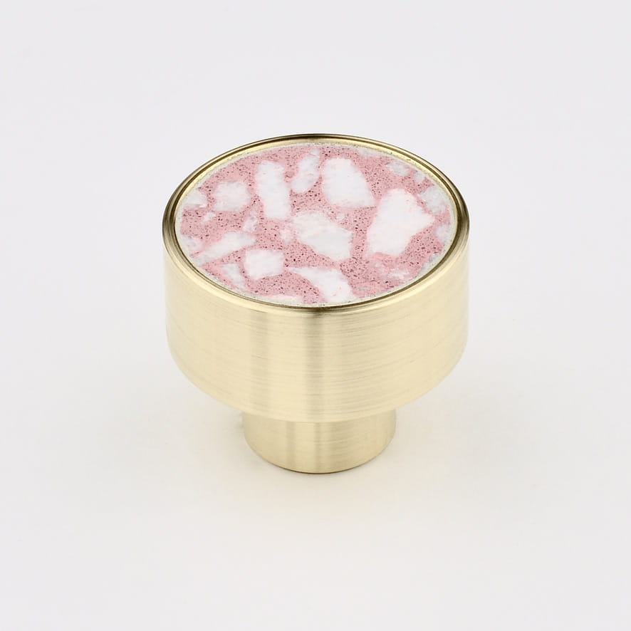 In den jüngsten Trends ist Terrazzo wieder in den Vordergrund des eleganten Designs gerückt. Traditionelle Muster dieses Materials haben in klassischen Innenräumen wieder ihren Platz gefunden. Wir möchten etwas Einzigartiges bieten, goldener Möbelgriff Mit rosa Terrazzo .